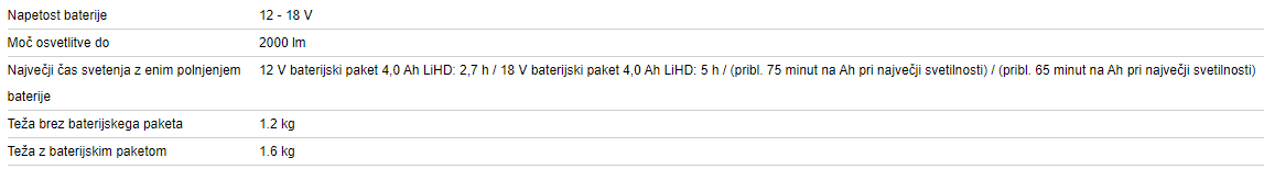 - Čas delovanja baterije pri največji svetilnosti 41 min na Ah, npr. 2,8 ur z enim baterijskim paketom LiHD 12 V/4 Ah