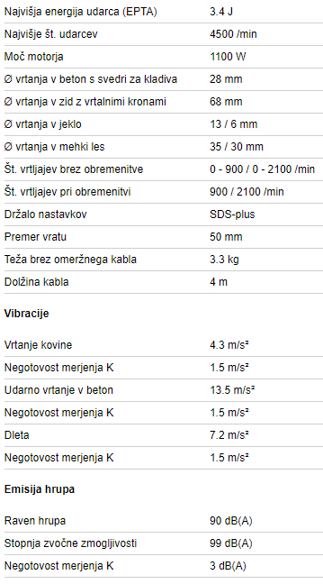 | Največje št. udarcev | 4500 /min |