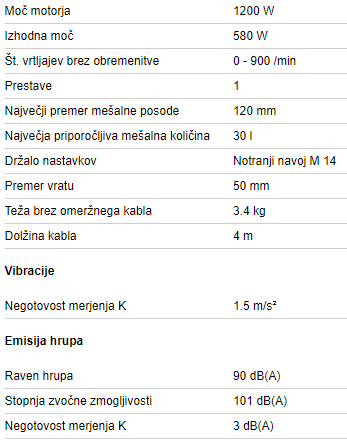 | Moč motorja | 1200 W |